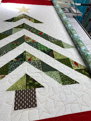What's on the Frame Today? Laura K's "Oh Christmas Tree" quilt. This is a free pattern on the Moda Bakeshop website. Laura chose the quilting pattern stars n' swirls. Then we used an olde golde thread.
