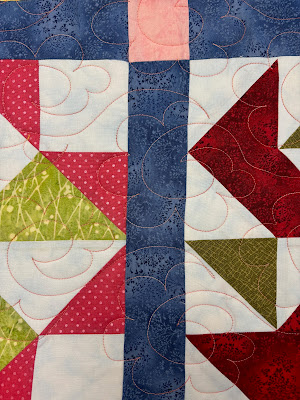 What's on the Frame? This is a quilt I did for Nancy D last week. We named is simply "Flowers", but I believe it was a block of the month through Sonflower Quilts. Nancy chose the quilting pattern Interlocking Simple Flowers. Then we used a variegated peach thread called Valley of the Kings. The peach thread picks up the theme from the peach cornerstones between the blocks.